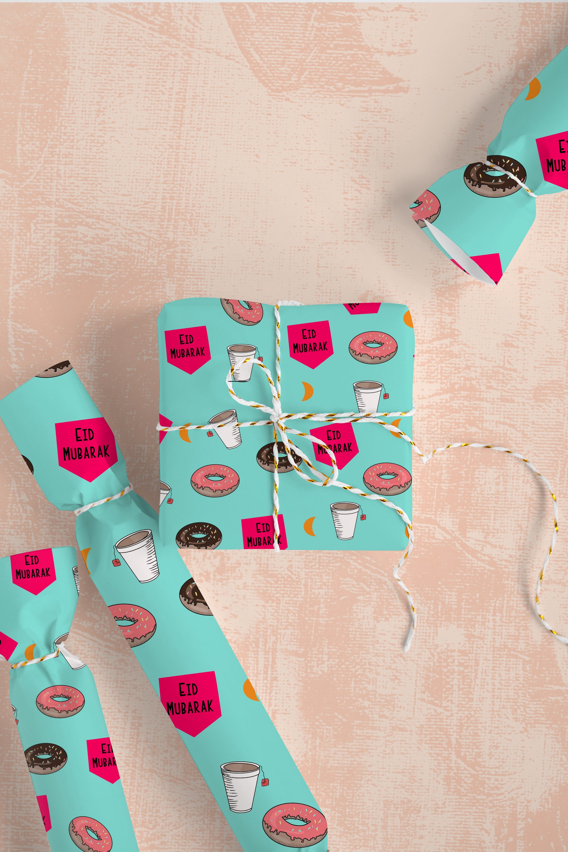 These cute ”Donuts & Chai” gift wrap sheets are inspired by eid day! Who doesn’t love their donuts and chai! Bursting with saturated colors, this wrapping paper is sure to add some whimsy to any gift.