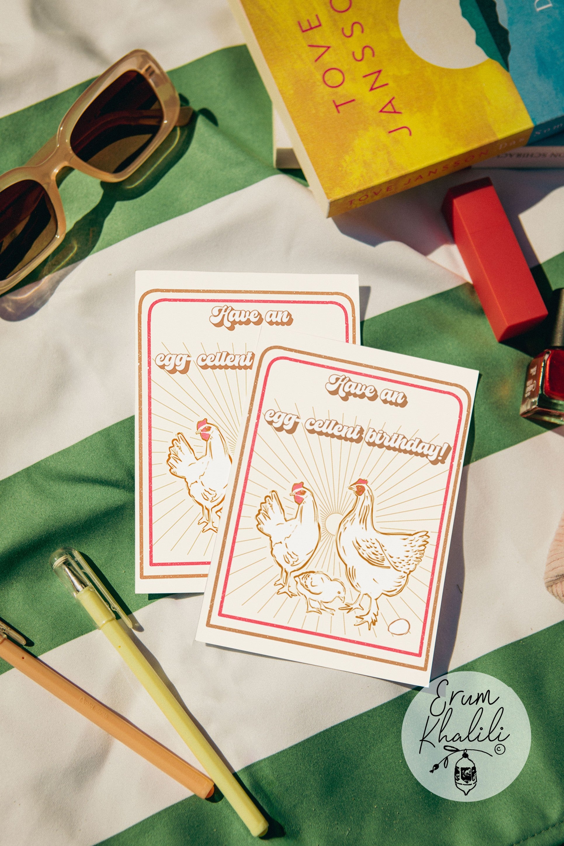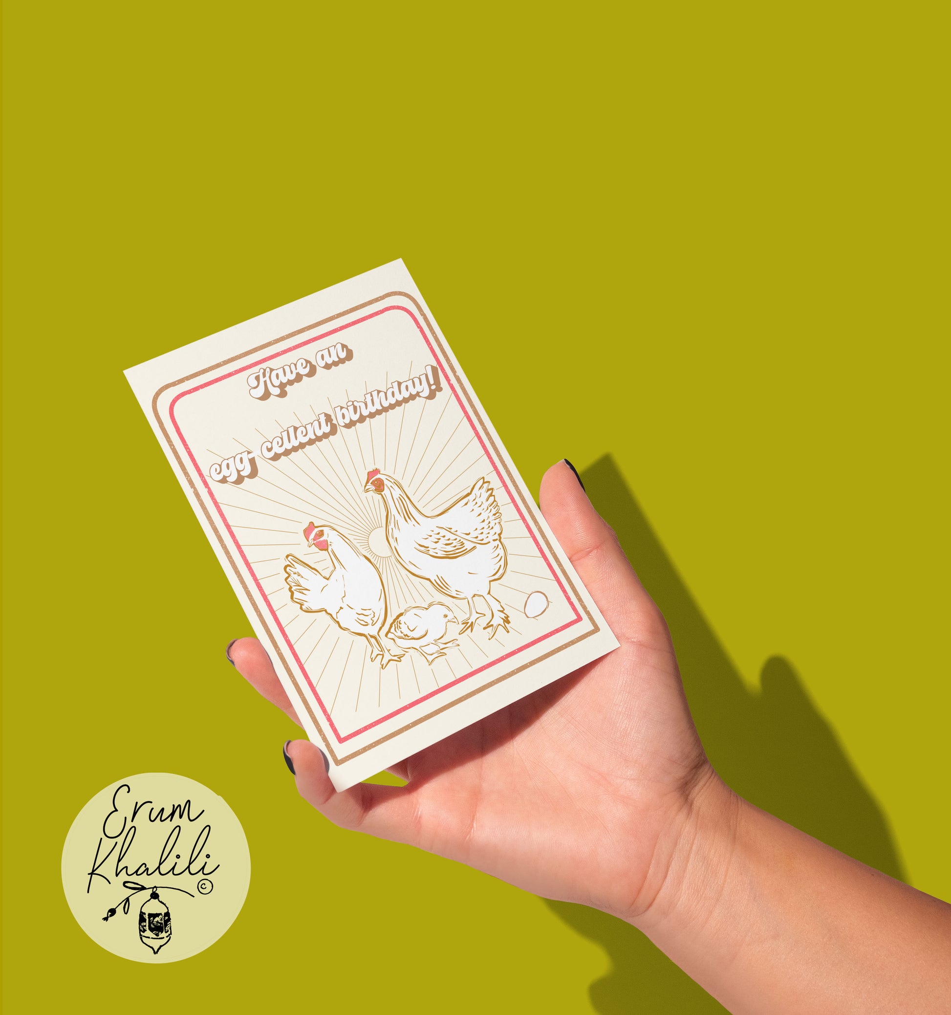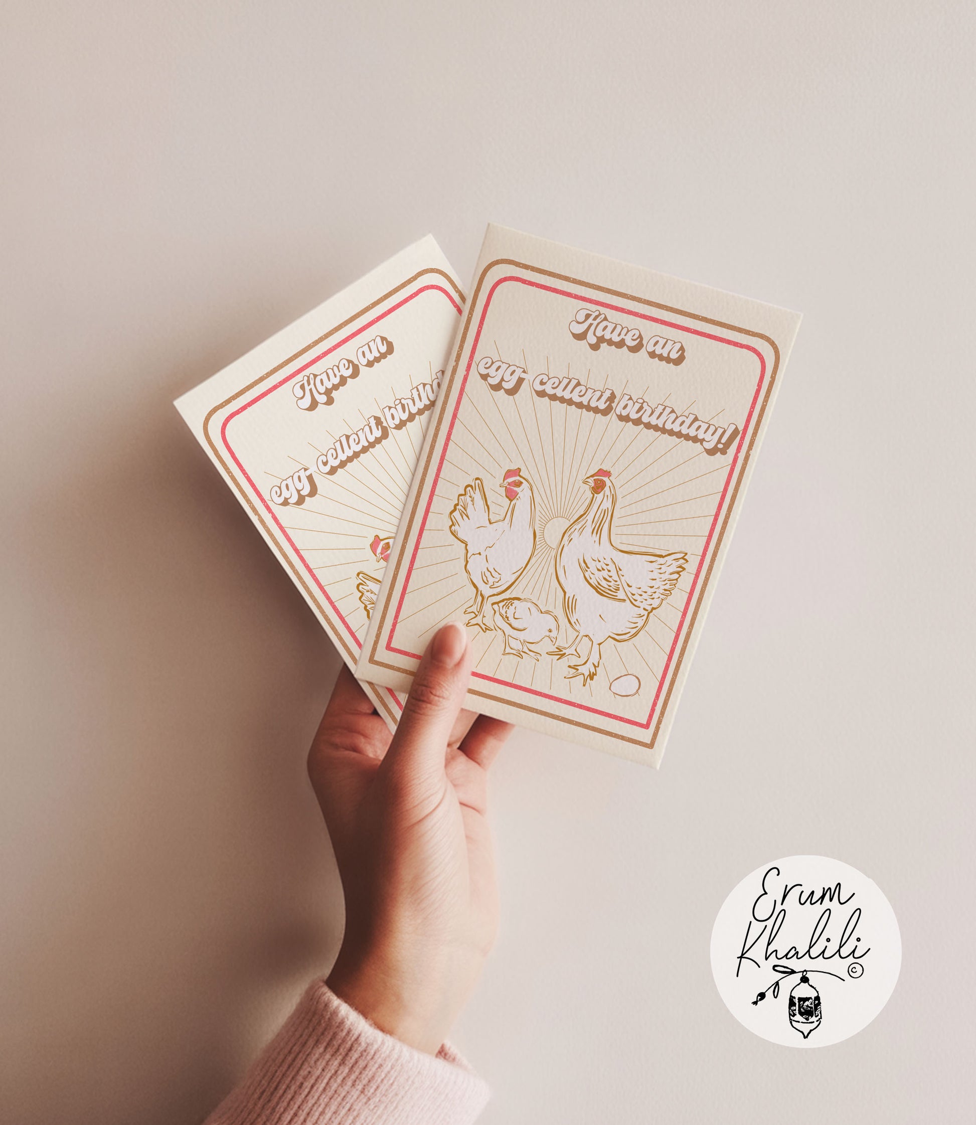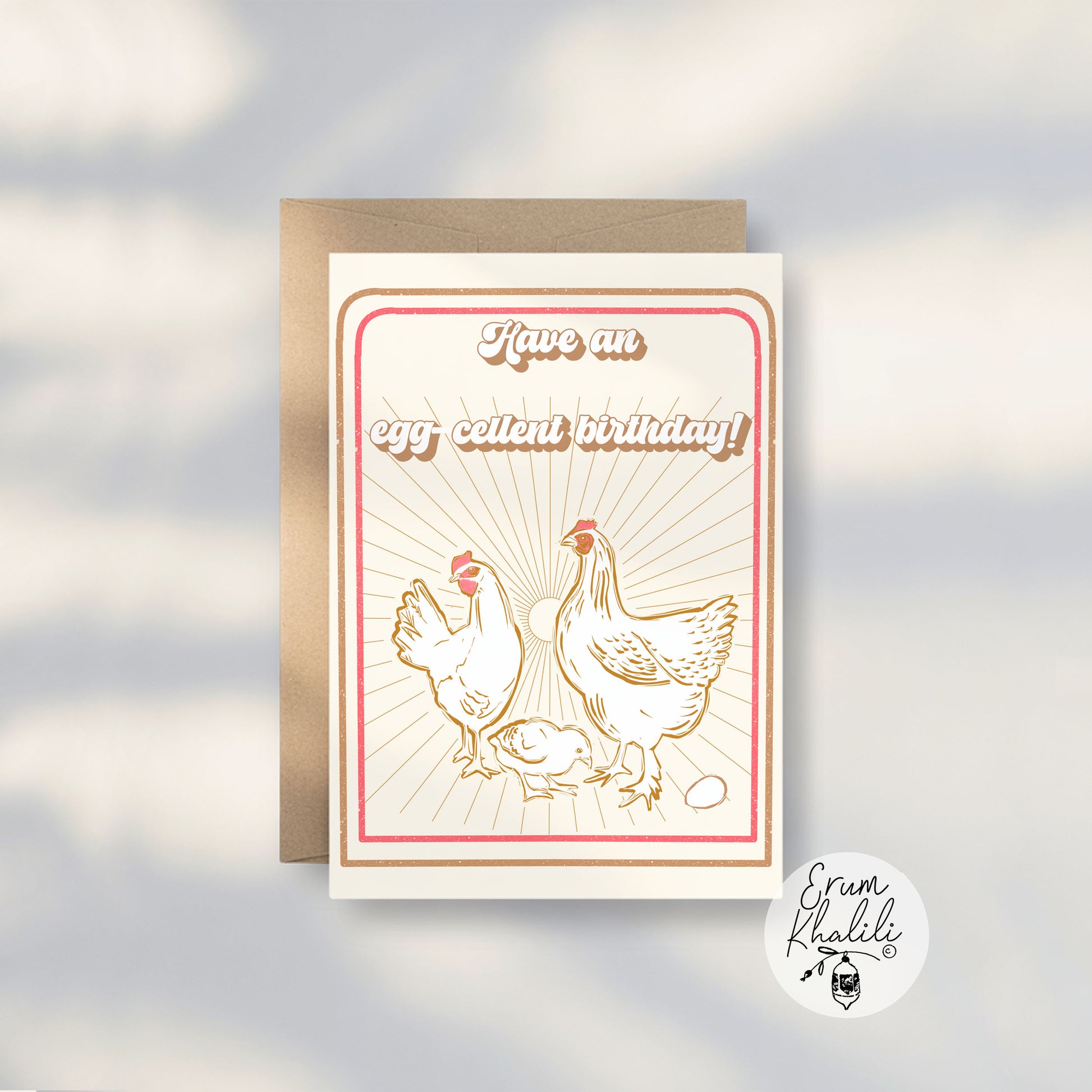 Egg-cellent Birthday Card – Whimsical Chicken Illustration