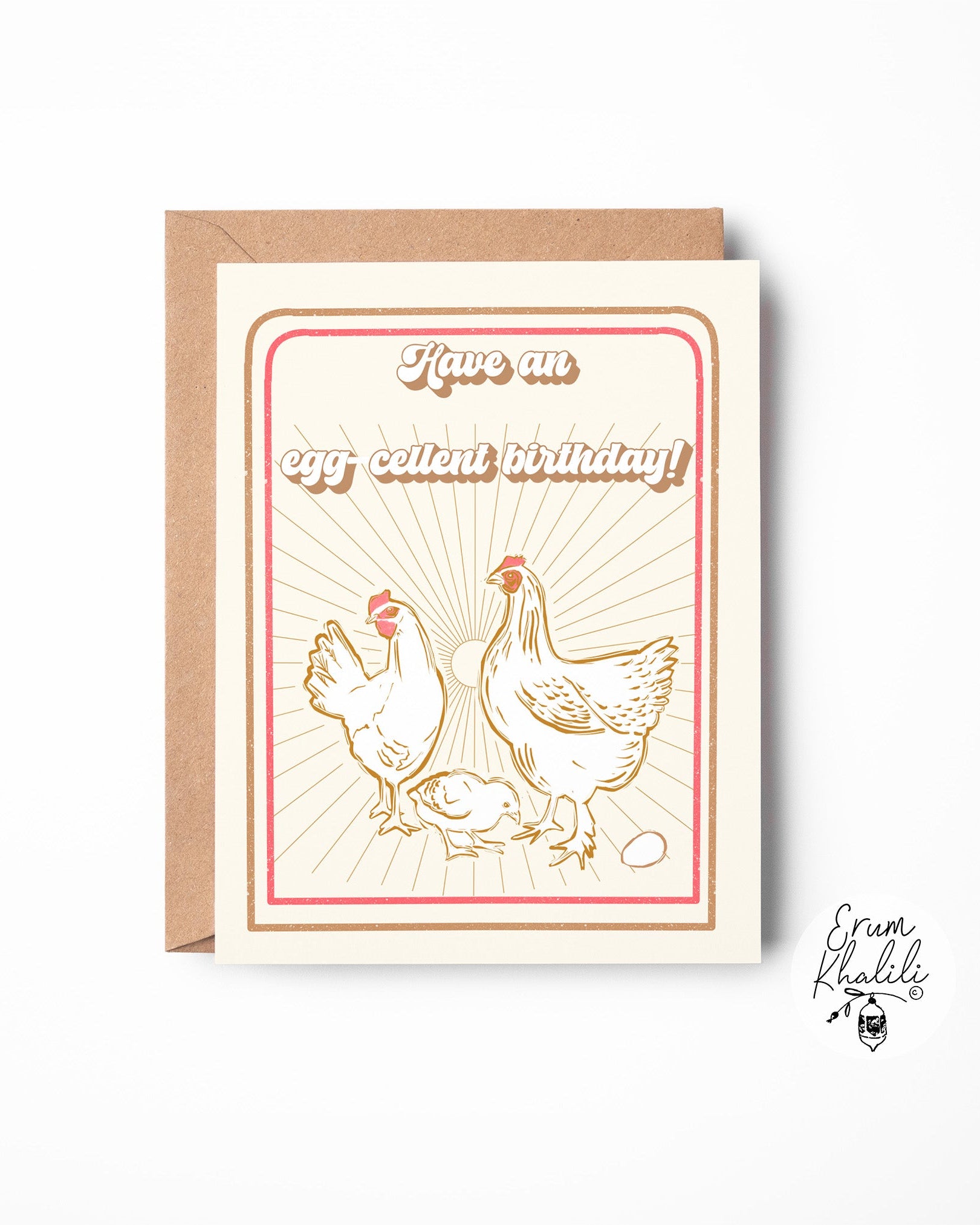 This playful birthday card features a cheerful illustration of chickens with the fun message “Have an egg-cellent birthday!” Framed in warm tones with a retro feel, it’s a lighthearted way to celebrate someone special and bring a smile to their day. Perfect for animal lovers, farm-inspired themes, or anyone who appreciates a good pun.