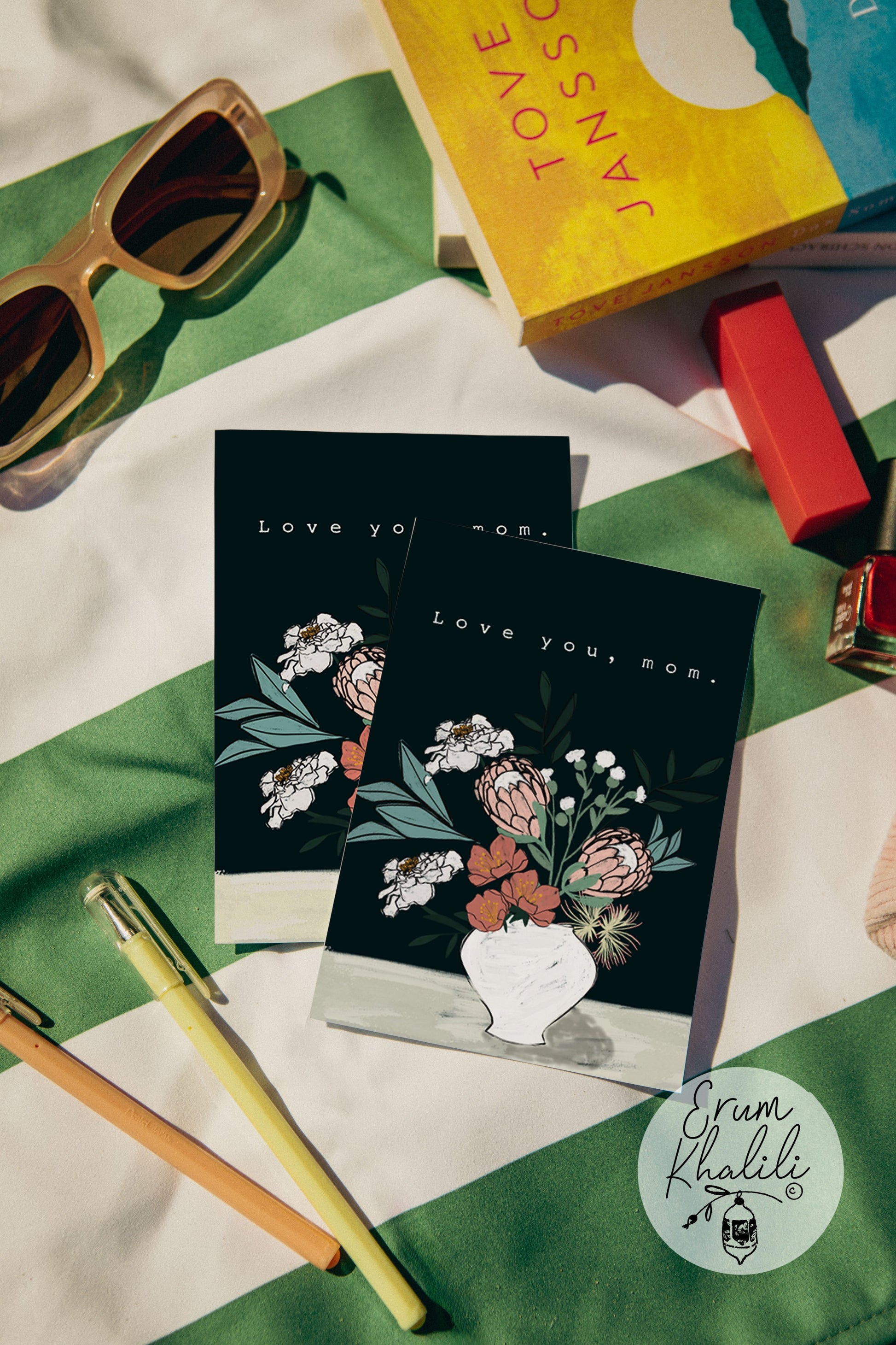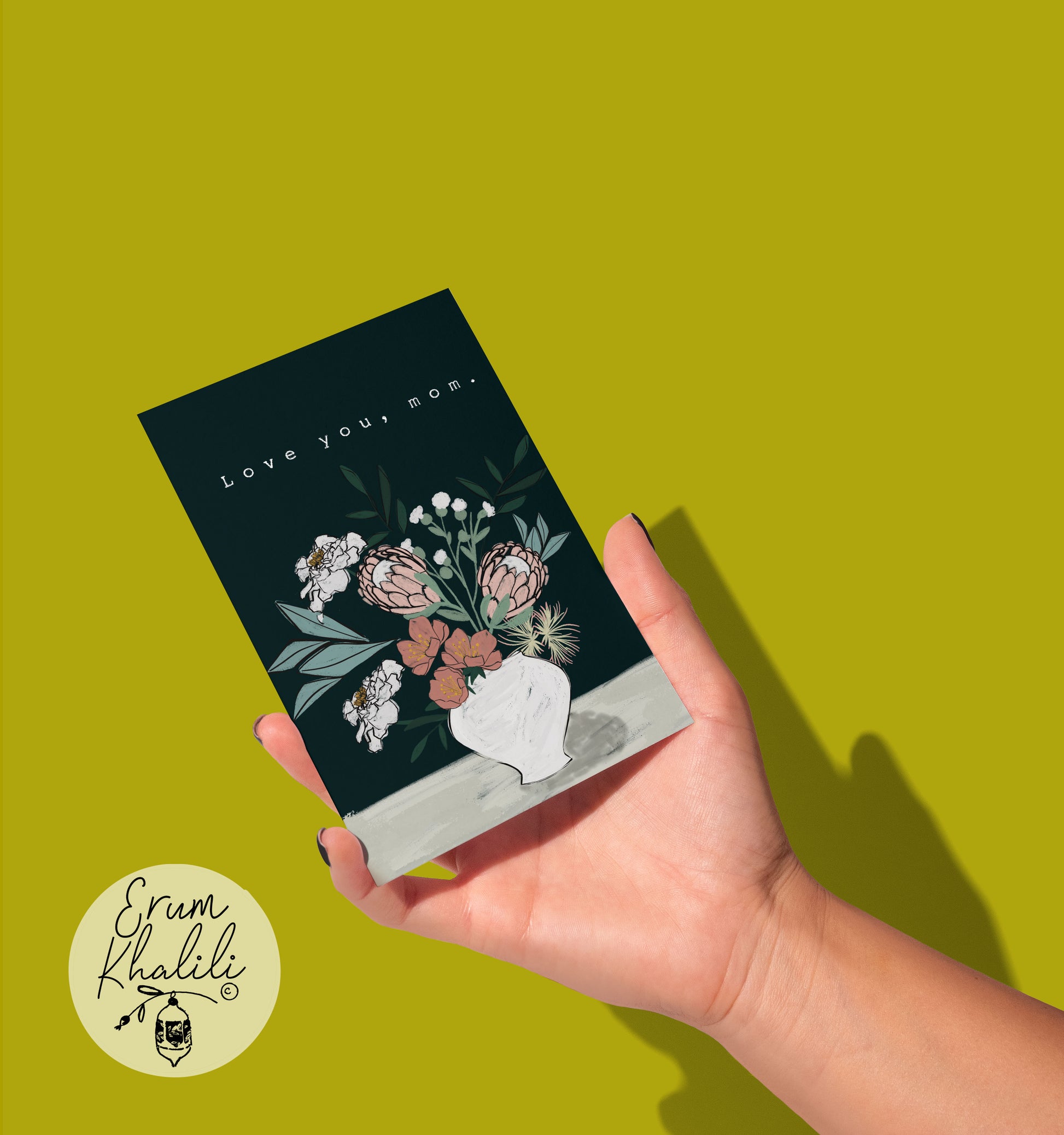 This card features a heartfelt “Love you, mom.” message paired with a hand-illustrated floral arrangement in a white vase. Soft blooms in earthy tones stand out against a deep background, creating a timeless and elegant design. Perfect for Mother’s Day, birthdays, or simply to show your appreciation and love.