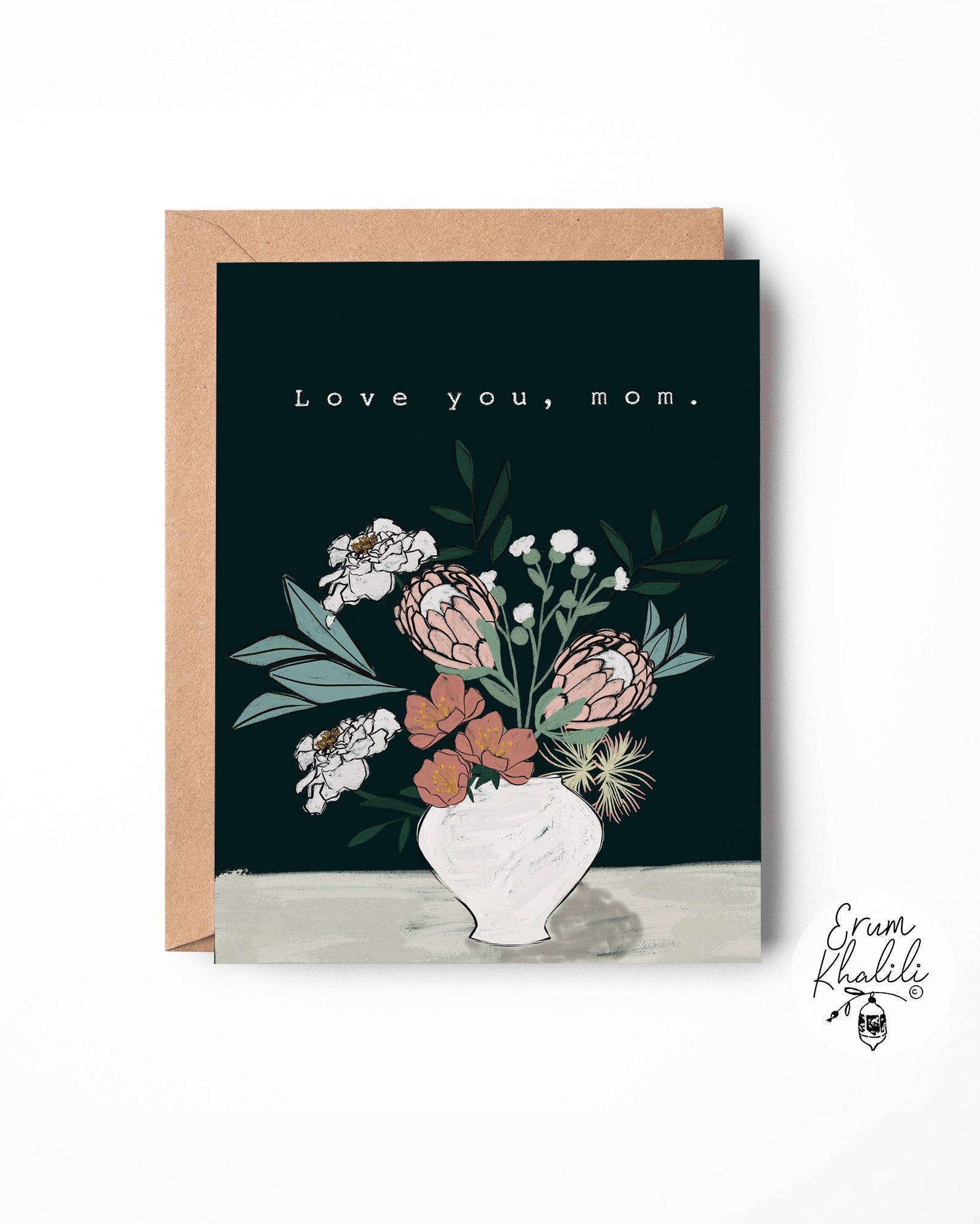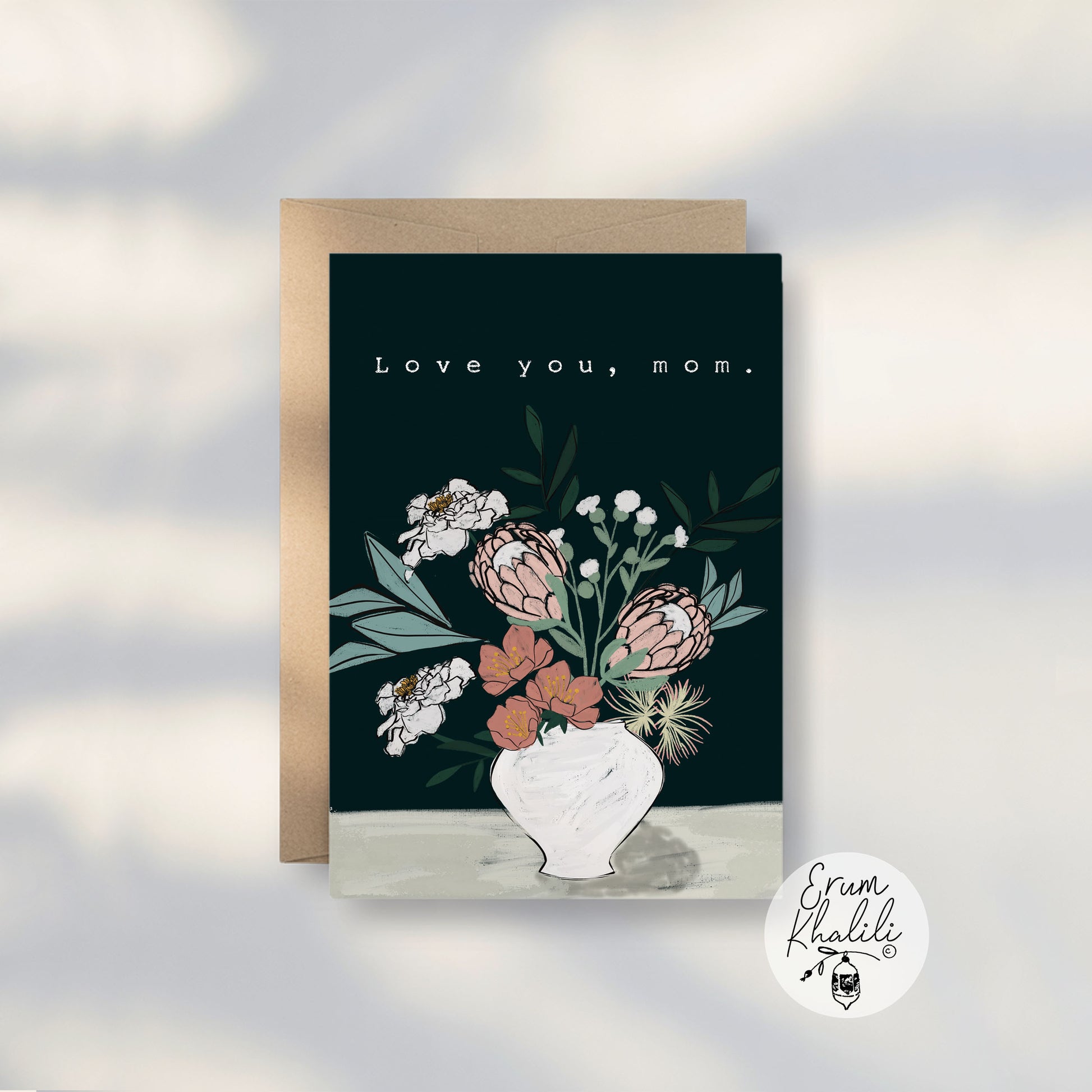 Love You Mom Card – Floral Vase Illustration on Dark Background