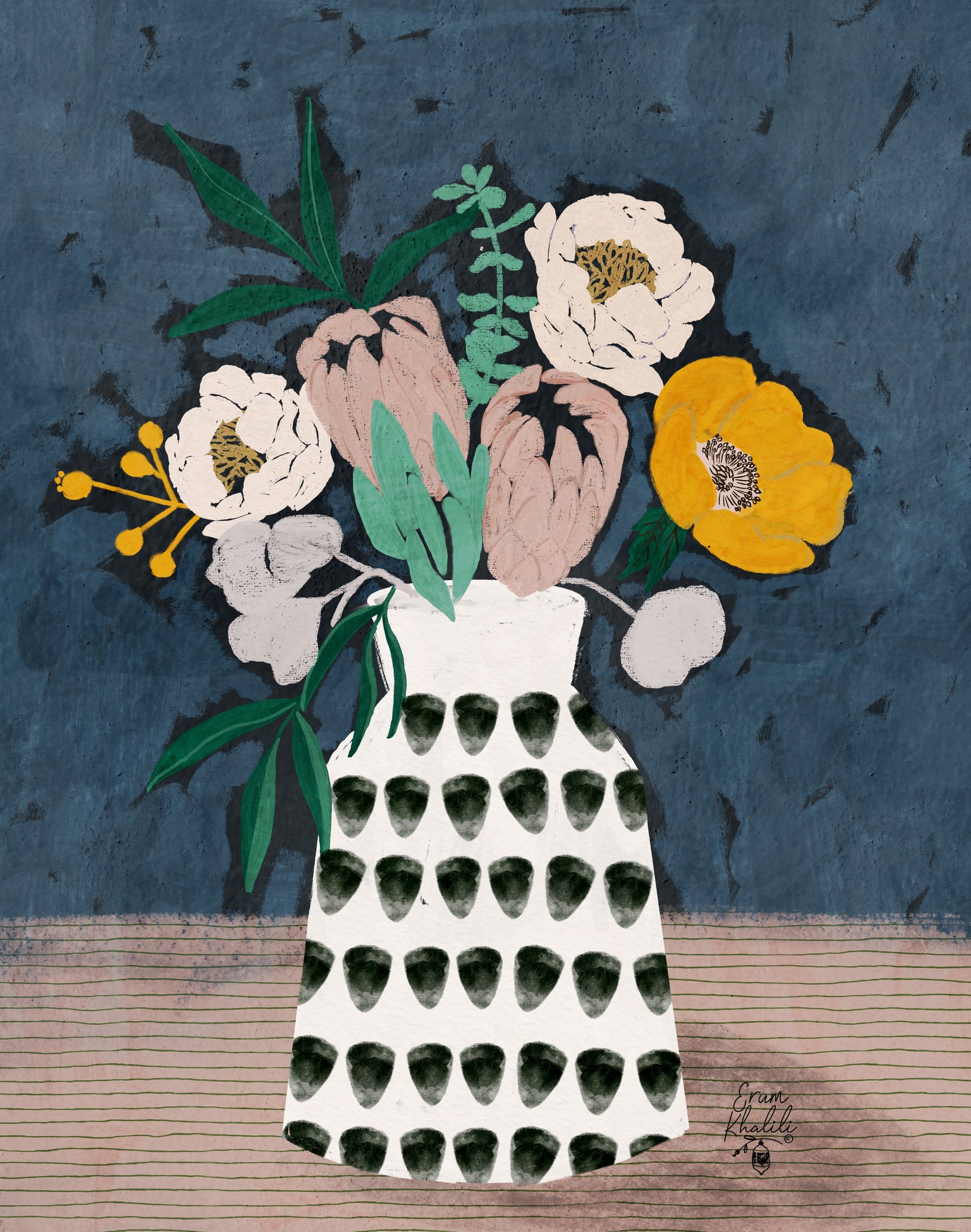 I’m Erum Khalili, an illustrator, designer & all-around creative. I’m based in sunny California, where the sun shines bright and the beaches are constantly luring me in. My artwork is comprised of limited color pallets, nature and texture. I work mainly in digital, but I also love gouache, sketching, ink and watercolor. All of the artwork you see in my shop is my own! Thanks so much for stopping by, it means the world to me.