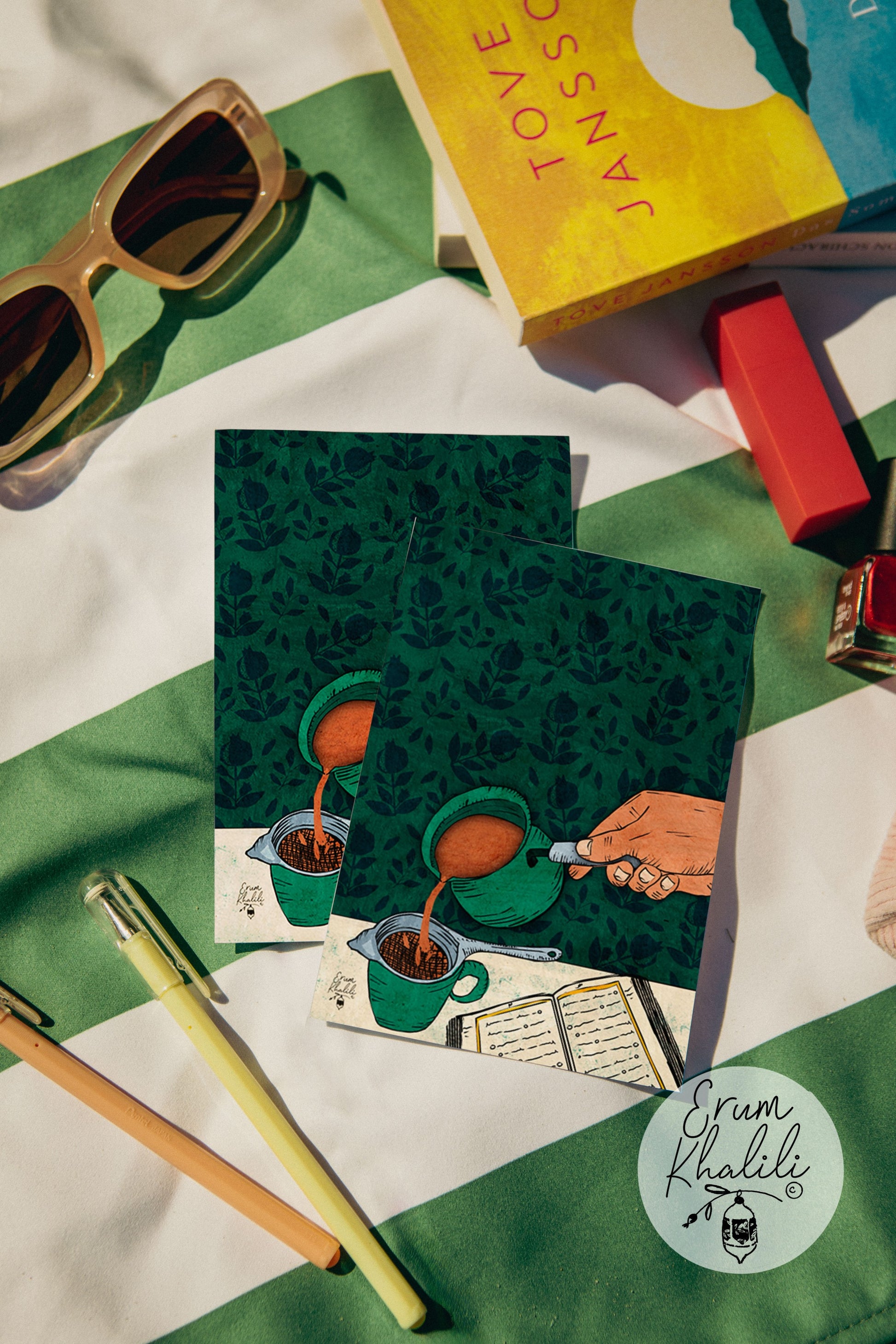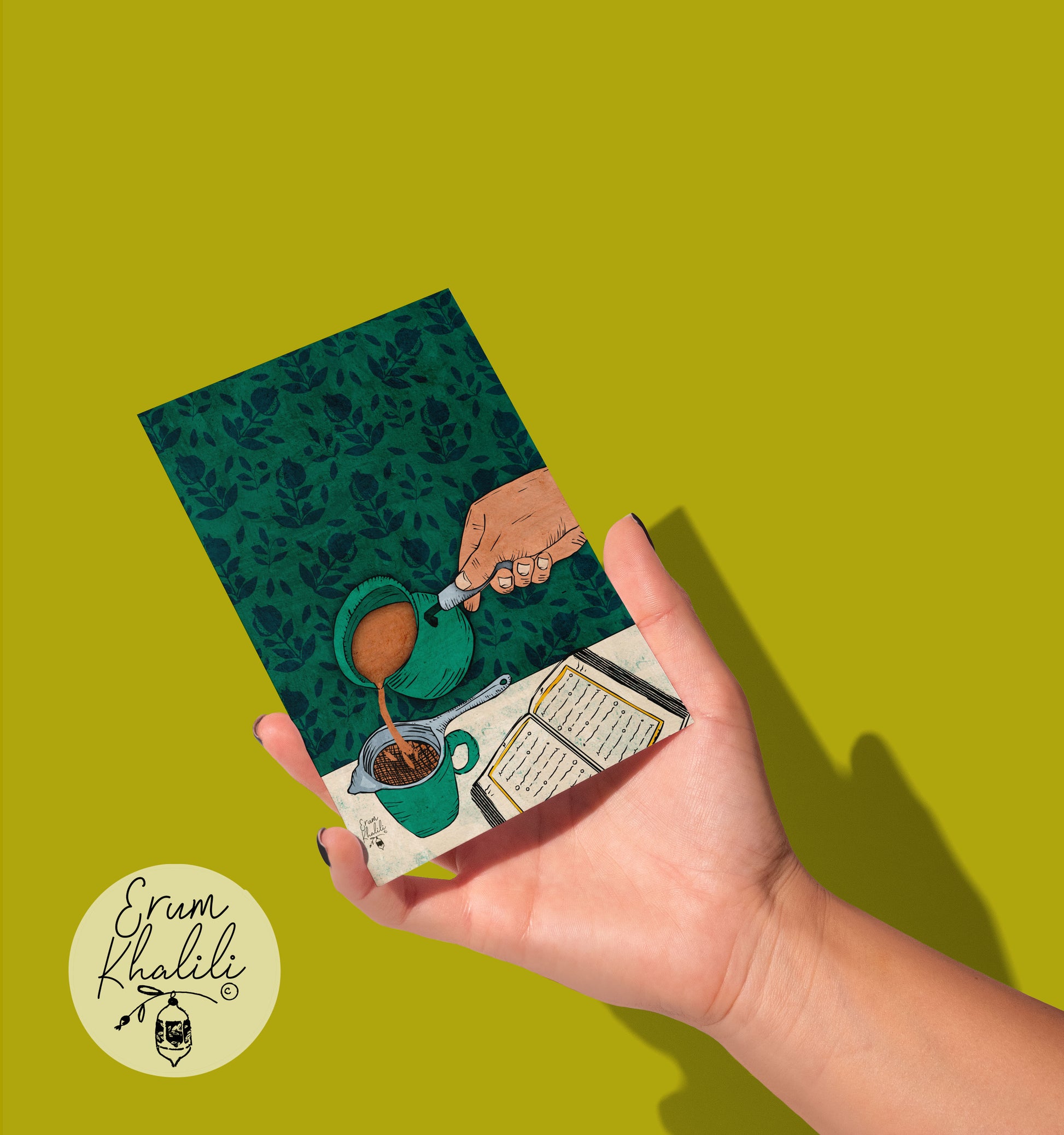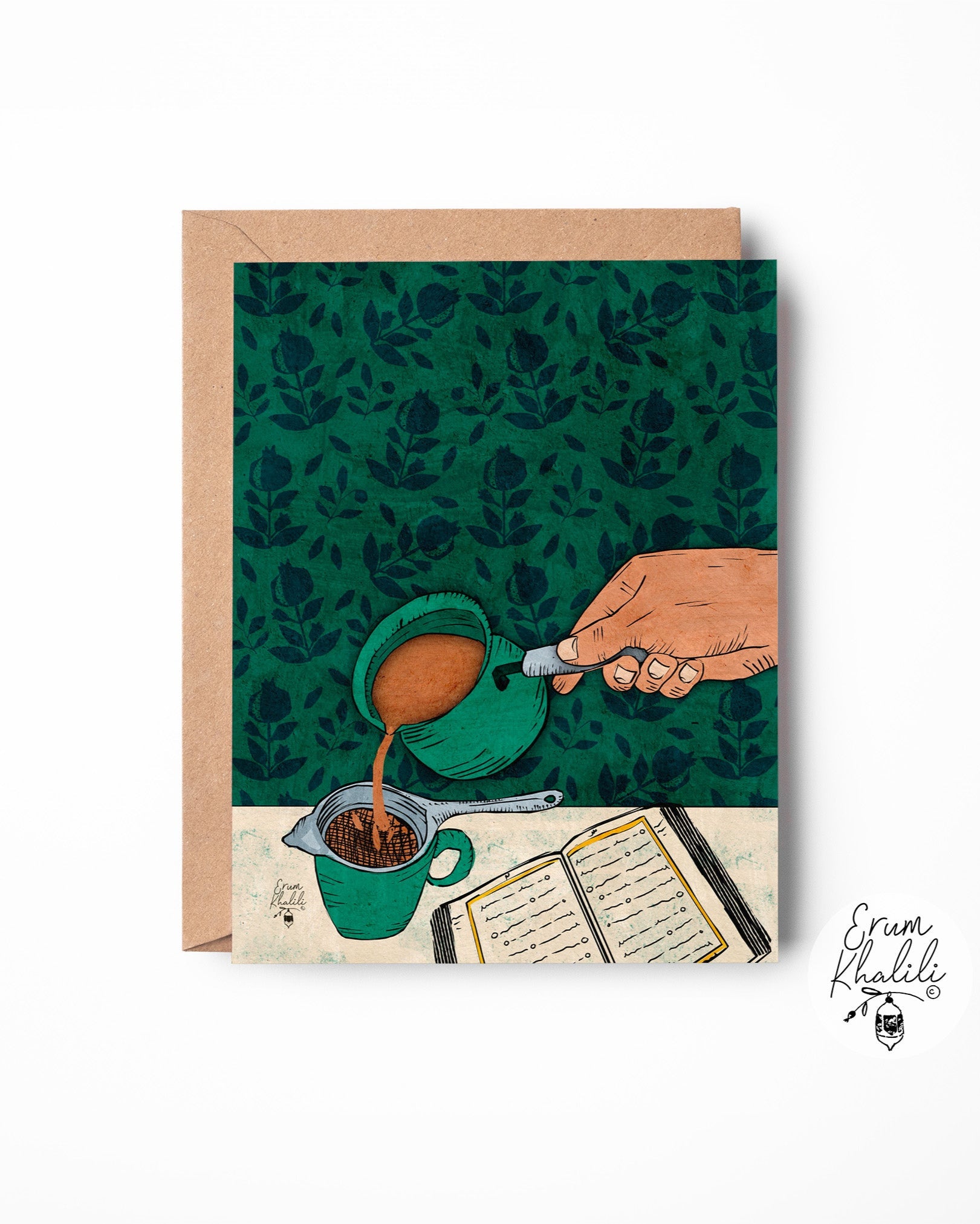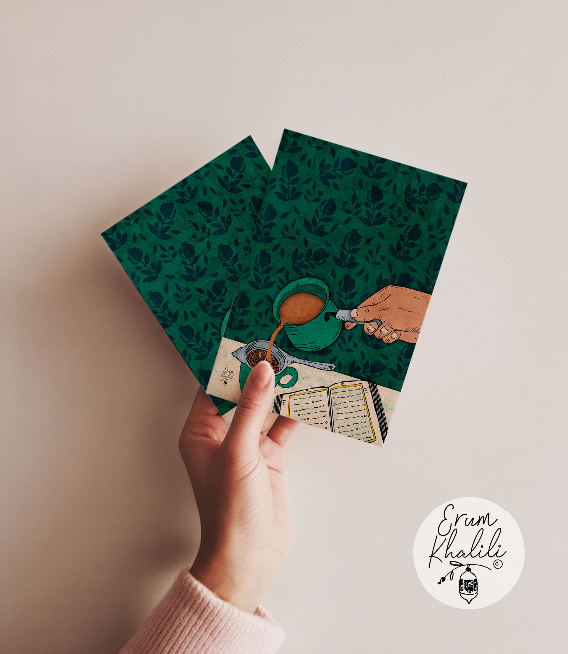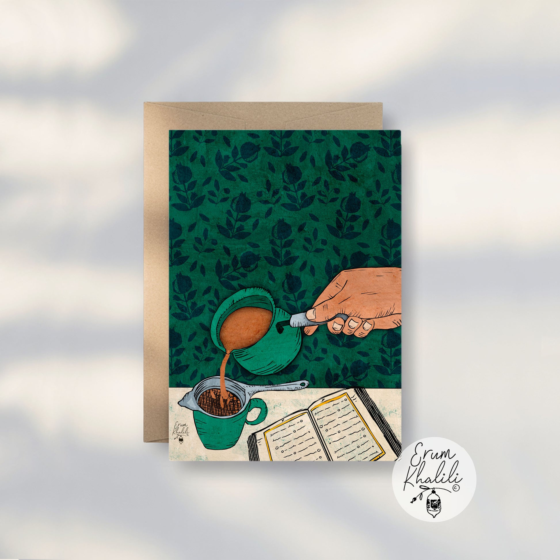 This card features a cozy illustration of chai being poured into a cup beside an open Quran. Set against a patterned green background with warm earthy tones, it captures the essence of comfort, reflection, and tradition — making it a thoughtful card for Ramadan, Eid, or any special moment of spiritual connection.