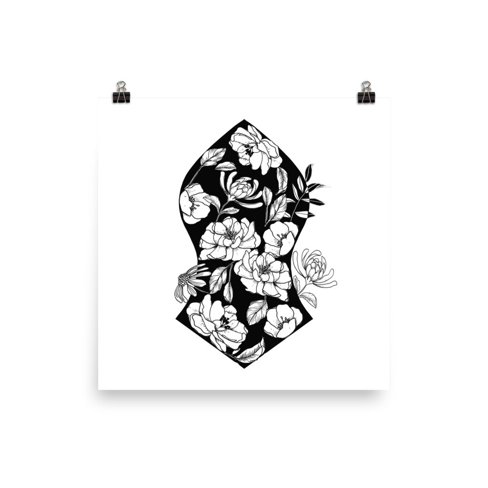 “The Blessed Sandals” artwork was designed by Erum Khalili. This floral piece was inspired by the shape of the prophet Muhammad PBUH’s Sandals. The floral artwork was first etched in a sketchbook with ink then transferred digitally. To see the entire process follow @erumkhalili on instagram.