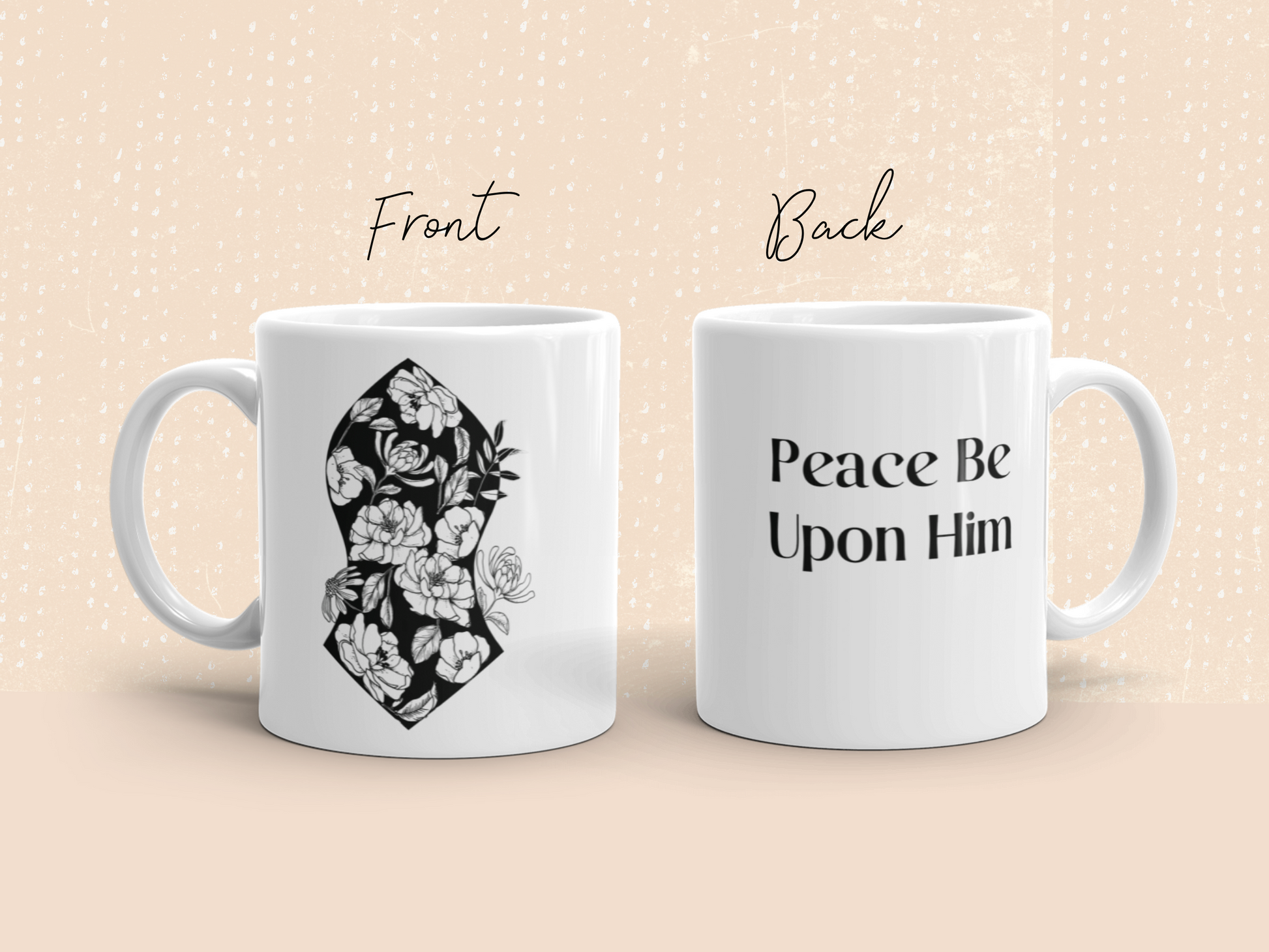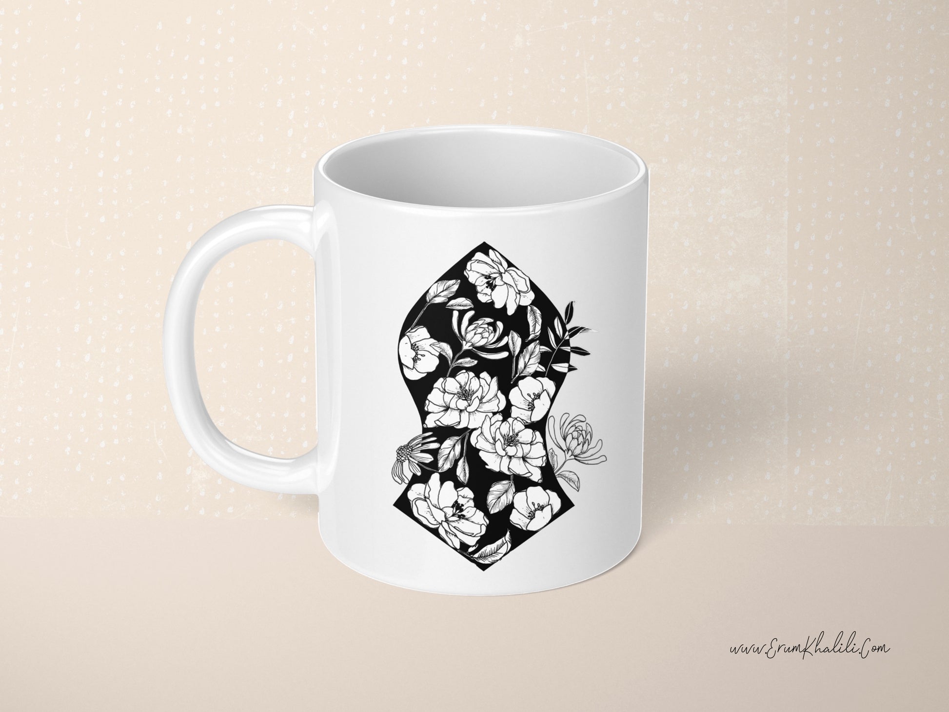 “The Blessed Sandals” artwork was designed by Erum Khalili. This floral piece was inspired by the shape of the prophet Muhammad PBUH’s Sandals. The floral artwork was first etched in a sketchbook with ink then transferred digitally. To see the entire process follow @erumkhalili on instagram.