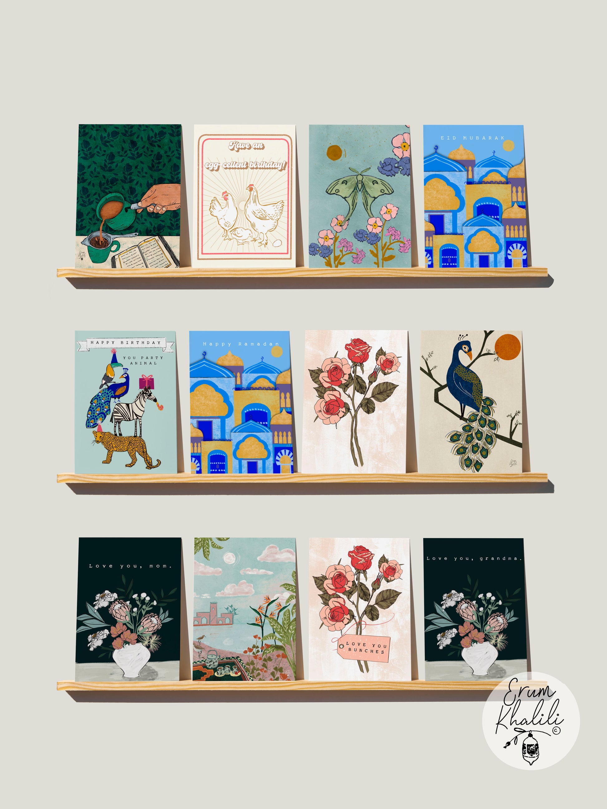This greeting card features an illustrated scene of Cappadocia, Turkey, with colorful hot air balloons rising over the town and detailed rooftops showing rugs, plants, and tea. A versatile design that works well for travel lovers and customers looking for unique, globally inspired cards.